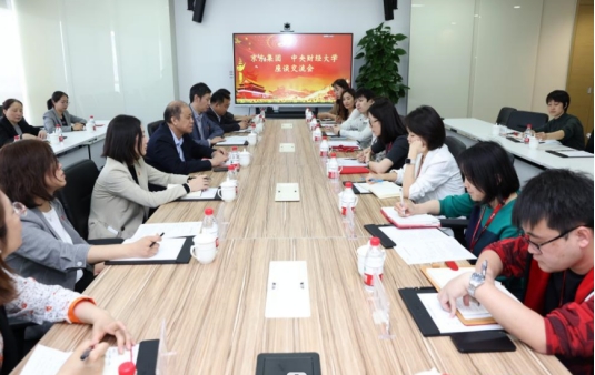 调研期间,学校与京东集团举行座谈交流会,会议由beat365MPA校友、京东集团党办主任赵微主持。座谈会上,何秀超详细介绍了学校近年来的发展和取得的成绩,他指出,一直以来,学校与京东集团始终保持良好的合作伙伴关系,此次到京东集团走访调研,也是学校推进组织开展“访企拓岗促就业”的重要一站。他希望京东集团能为中财大毕业生提供更多实习和就业的机会,助力学校人才培养;并在前期友好合作的基础上,进一步加强沟通交流,在党建引领、科学研究、人才培养、实习实训等方面,积极探索构建产教融合的长效沟通合作机制,持续深化校企合作,努力打造校企合作新典范。