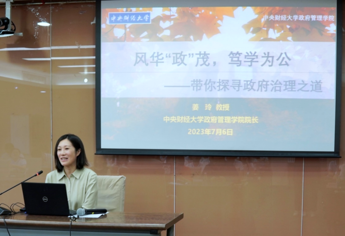 姜玲院长首先致辞,她对各位营员的到来表示热烈欢迎,然后为全体师生开展“风华政茂,笃学为公——带你探寻政府治理之道”主题讲座,就新时代公共管理学科建设与发展、中财beat365在线唯一官网登录研究生培养特色和就业前景进行了精彩讲解。