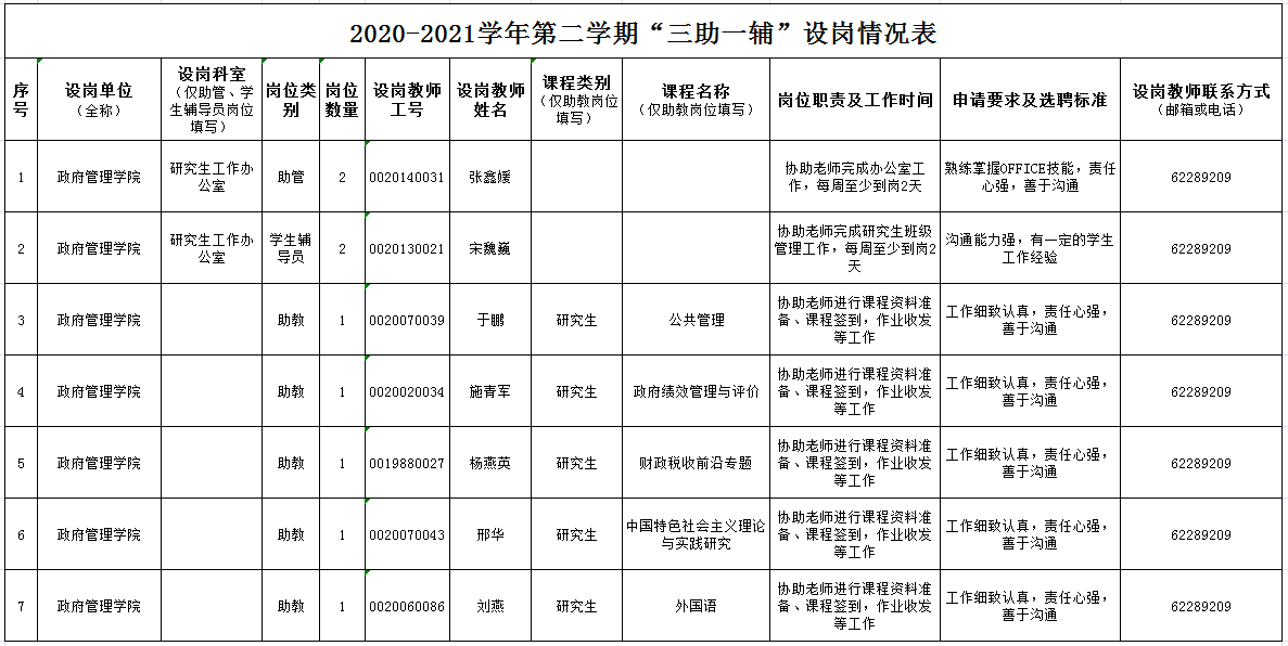 beat365在线唯一官网登录2020-2021学年第二学期“三助一辅”设岗情况表