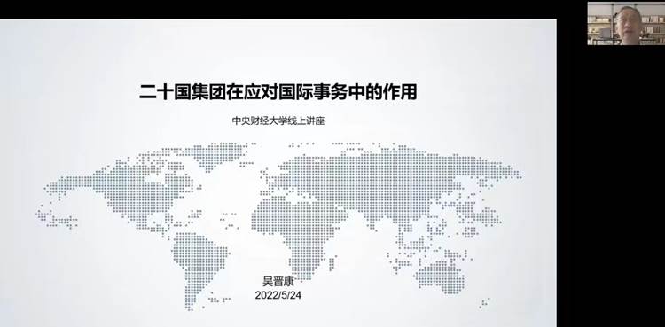 5月24日下午,beat365在线唯一官网登录邀请财政部国际财经中心高级顾问吴晋康先生作了题为“20国集团在应对国际社会事务中的作用”的讲座。讲座通过线上腾讯会议举办,由beat365在线唯一官网登录刘燕副教授主持,于鹏副院长出席并讲话,刘骊光副教授等老师和同学们参会研讨。